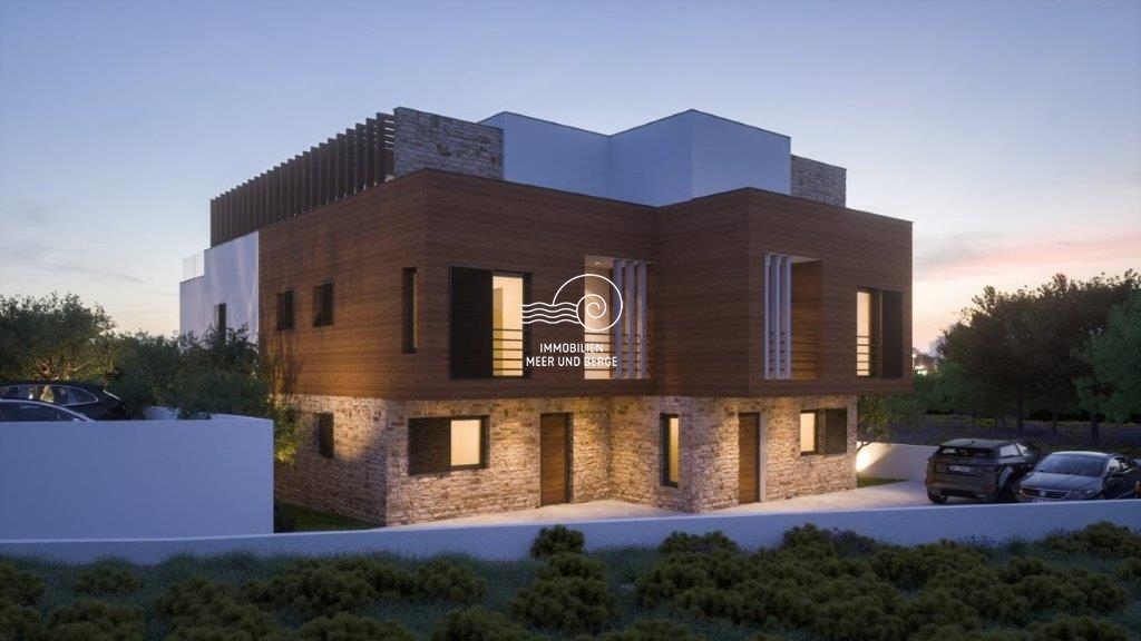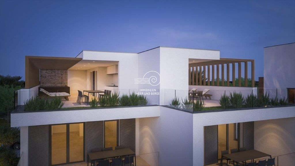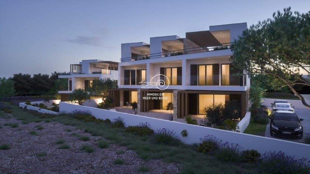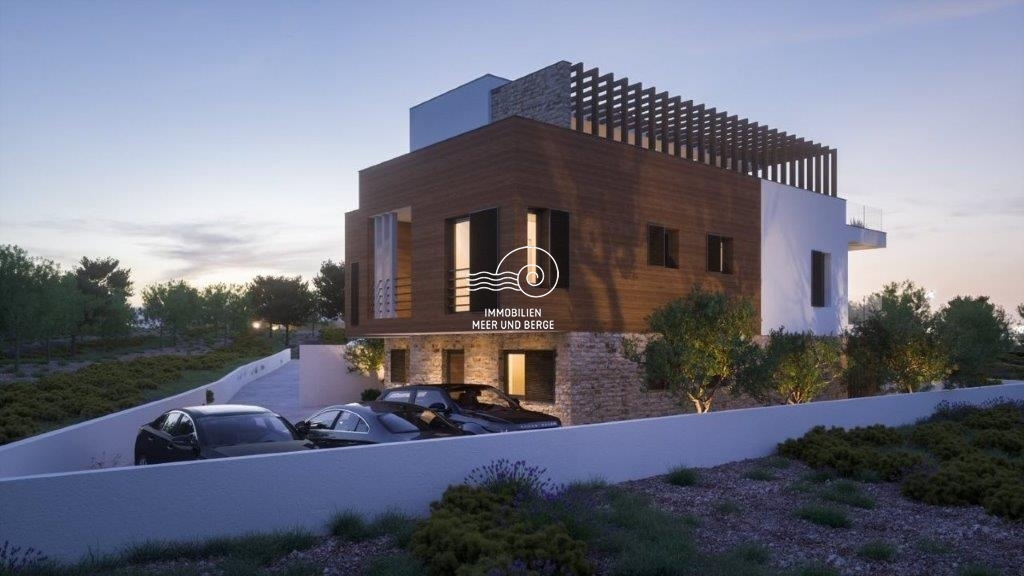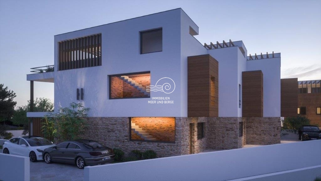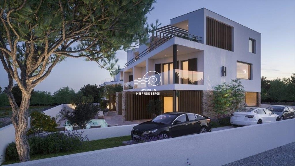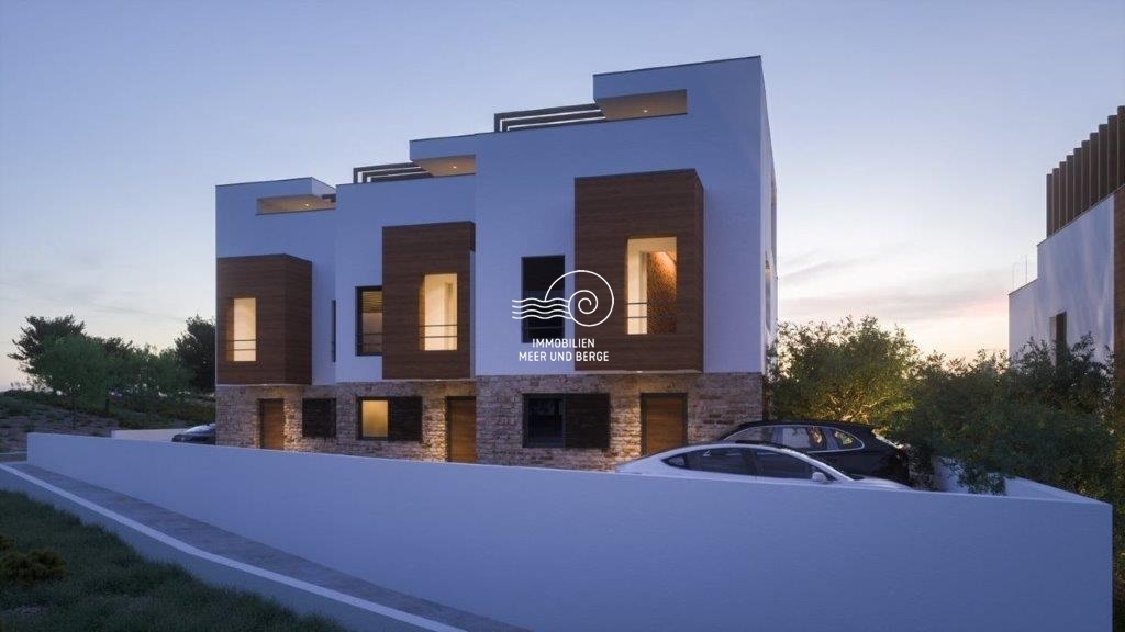 Haus B hat 210 m2 Nettonutzfläche mit berechneten Koeffizienten, erstreckt sich über drei Etagen und besteht aus: überdachtem Eingang, Flur mit Treppe und Garderobe, Schlafzimmer 1, Waschküche, Bad, Küche und Esszimmer, Wohnzimmer, überdachter Terrasse, im ersten Stock Etage: Flur, Schlafzimmer 2, Loggia, Badezimmer, Schlafzimmer 3 mit eigenem Bad und Loggia, im zweiten Stock gibt es eine schöne Dachterrasse
