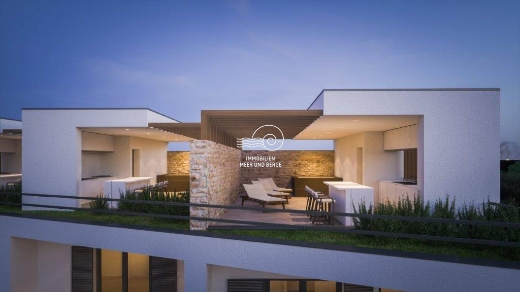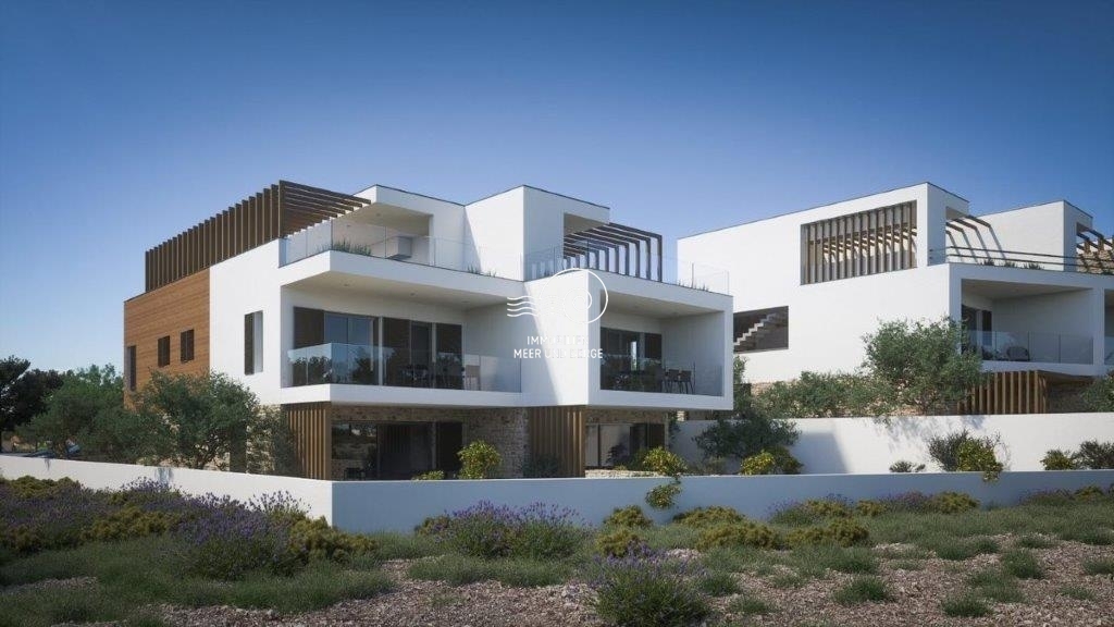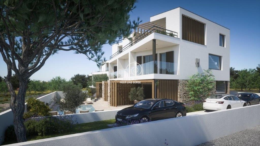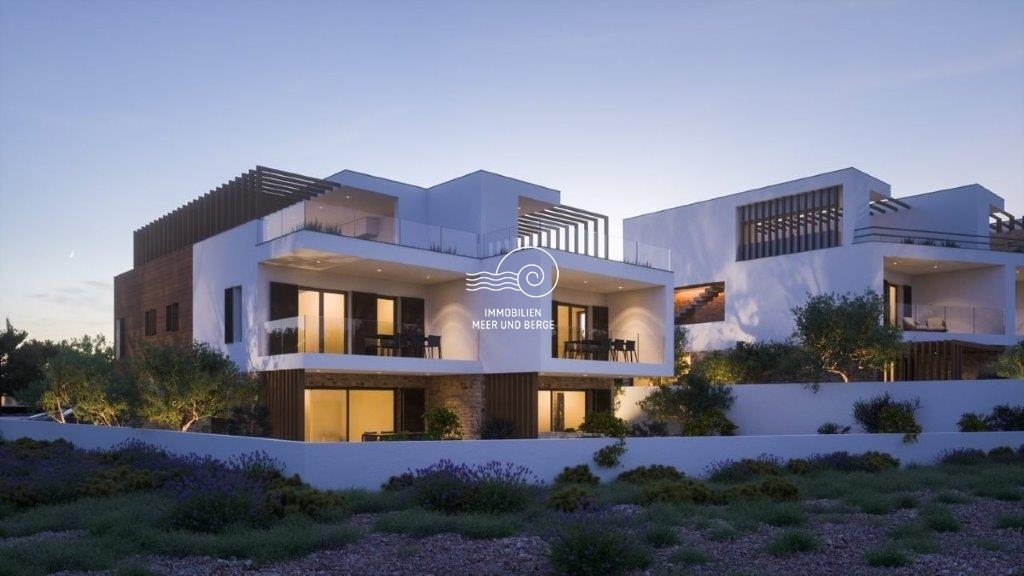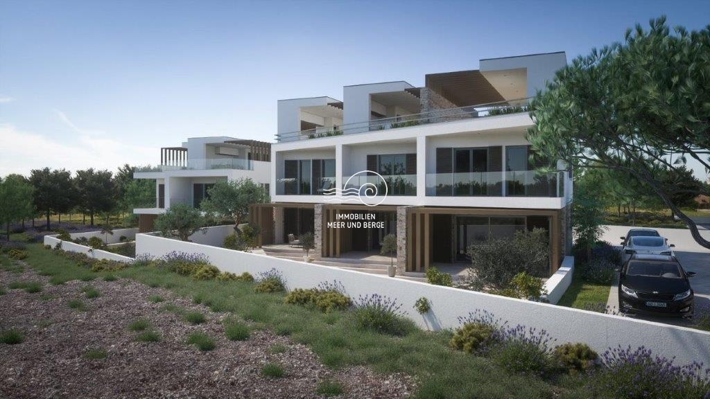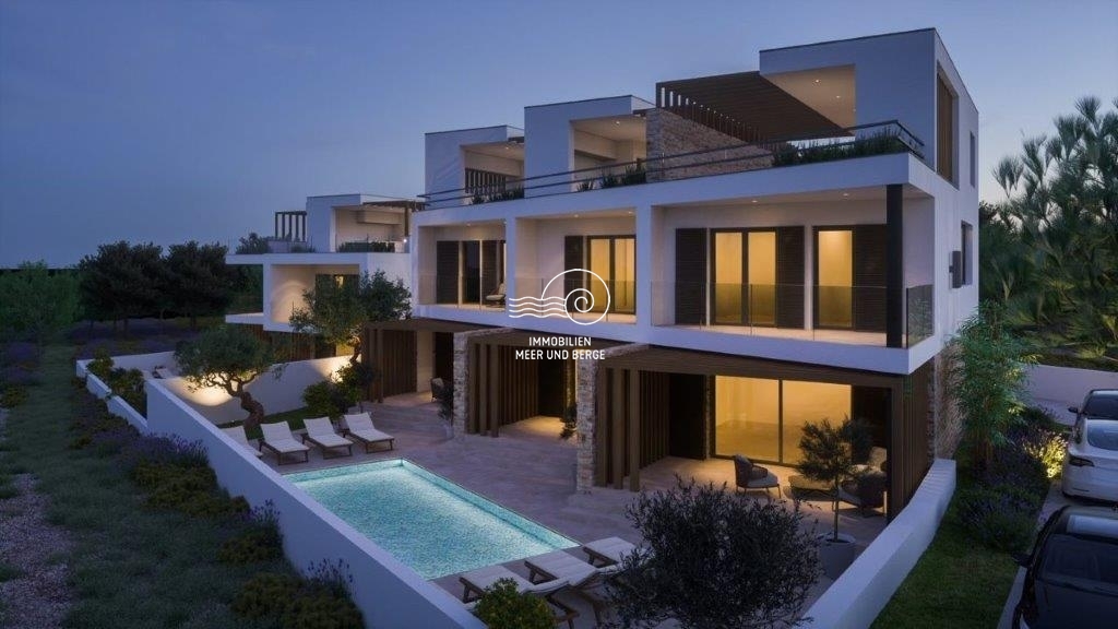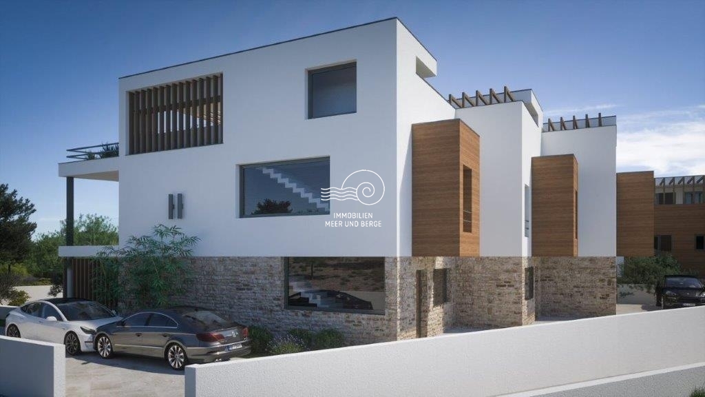 Haus B hat 210 m2 Nettonutzfläche mit berechneten Koeffizienten, erstreckt sich über drei Etagen und besteht aus: überdachtem Eingang, Flur mit Treppe und Garderobe, Schlafzimmer 1, Waschküche, Bad, Küche und Esszimmer, Wohnzimmer, überdachter Terrasse, im ersten Stock Etage: Flur, Schlafzimmer 2, Loggia, Badezimmer, Schlafzimmer 3 mit eigenem Bad und Loggia, im zweiten Stock gibt es eine schöne Dachterrasse